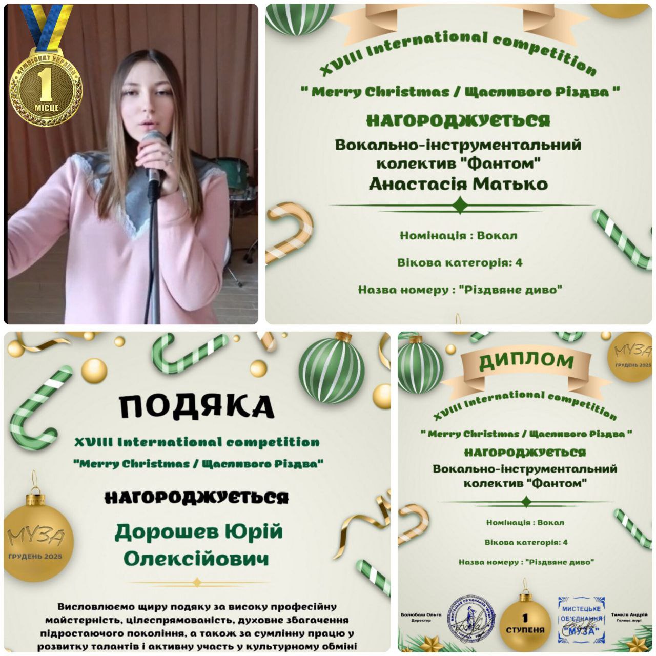 Вітаємо Анастасію МАТЬКО, учасницю вокально-інструментального гуртка «Фантом» Закладу професійної (професійно-технічної) освіти «Чугуївський регіональний центр професійної освіти Харківської області» з отриманням диплому першого ступеня в номінації «Вокал» у XVІІІ міжнародному конкурсі «Merry Christmas / Щасливого Різдва», організованому мистецьким об’єднанням «Муза».