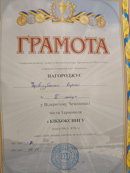 Вже вкотре наш вихованець підтверджує свій статус чемпіона в чергових поєдинках з кікбоксингу. Так, 15.02.2025 року в Тернополі відбувся чемпіонат міста з кікбоксингу, де Кирило ЧЕРНОЗУБЕНКО завоював ІІ почесне місце. Адміністрація Чугуївського регіонального центру професійної освіти Харківської області разом з колективом фізичної культури вітає Кирила з перемогою та бажає досягнення нових сходинок з цього виду спорту.